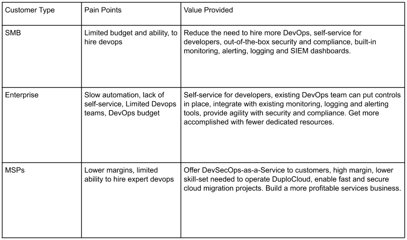 We are currently serving three different types of customers: SMBs, Enterprises and MSPs. Table 1 below shows the key use cases we provide and the pain points we solve for them.