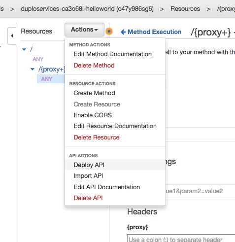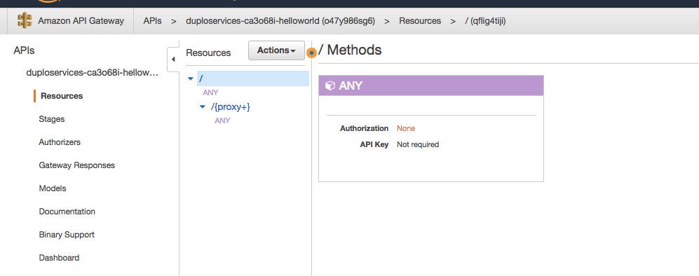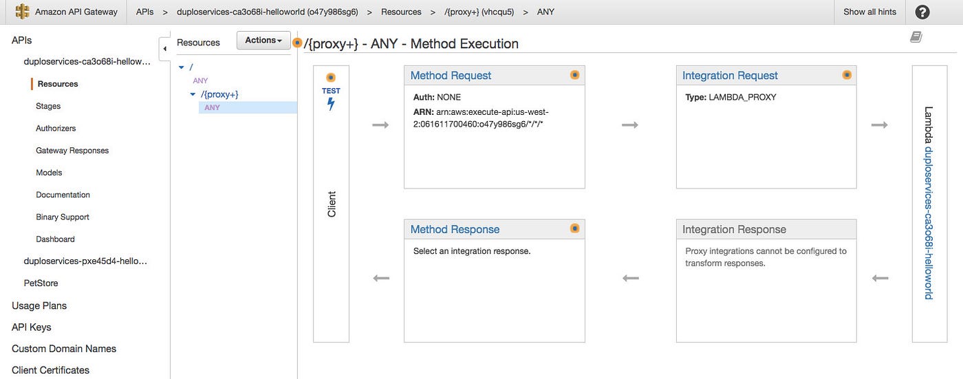 In the Duplo Portal, select the API Gateway line in the table and click on AWS Console button below and it will take you to API Gateway screen that will look like