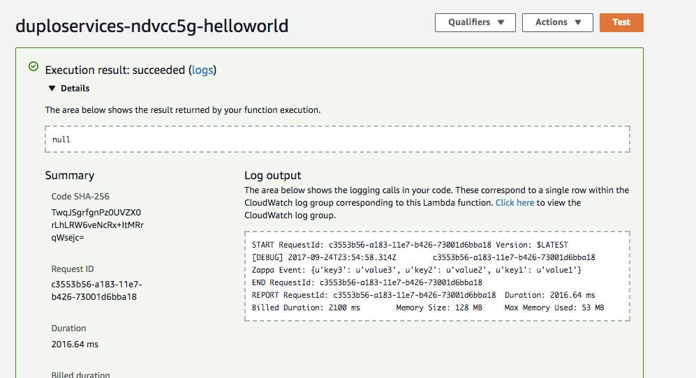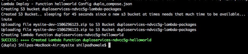 Now run the following command to deploy the lambda function. Note the command has two aa in the word lambdaa This is because we wrote the cli using python and lambda was a language keyword. Let us know @ venkat@duplocloud.net if you a workaround.