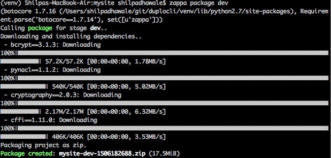 Here helloworld is the name of the function in the duplo_compose.json. DuploCli will look for the specifications of the function helloworld and use it to create a deployment in your workspace in AWS. <zipfilepath> is the package zappa created in step 6. The output of the above command will be like