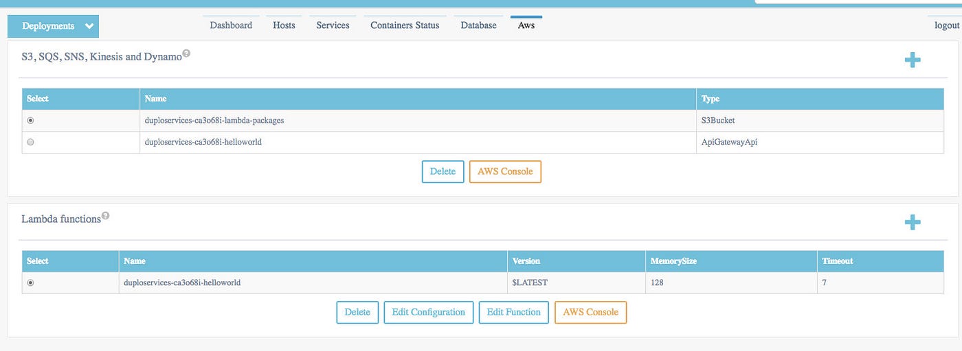 From a web browser, login to duplocloud again and go to AWS tab. You will see your S3 bucket and Lambda function. Following is a screen shot of my workspace