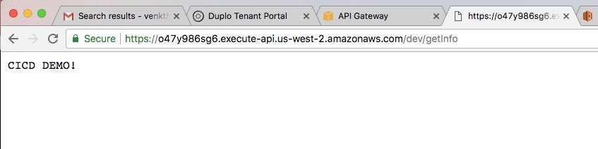 Now you can take the URL, append /getInfo and open it in a browser and you should see “CI/CD Demo!” as shown below.
