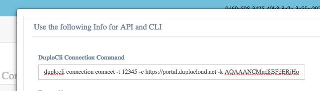 If you have signed up for a DuploCloud account account in step 1, login to the portal. In the Dashboard click on the API icon and it will display the cli command like the following example screen shot