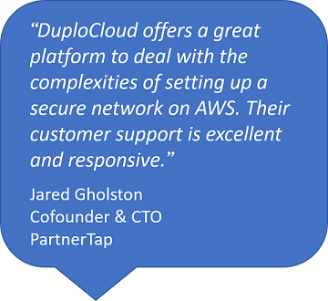 The DevSecOps based approach of DuploCloud simplified spinning up new environments, easily managing AWS interface. In addition, the platform provided an easy-to-use UI interface that made it easier to share commands. The automation bot improved their deployment process, allowing them to keep track of deployment history as more releases happen for easy future references. DuploCloud helped PartnerTap successfully get through the SOC2 audit by providing penetration tests, monitoring services and guidance for the project.