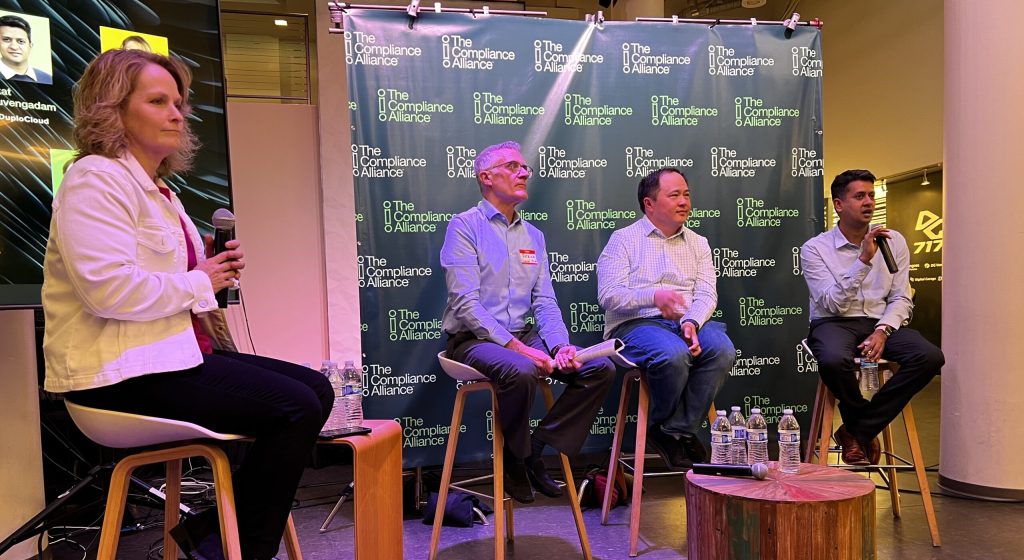 DuploCloud participated in a collaborative event at Digital Garage in San Francisco with Founder’s Village, aimed at helping technology startups untangle the intricacies of security and compliance. The fireside chat panel, moderated by Cheryl Cage from the AWS Global Security and Compliance Acceleration (GSCA) partnership team, featured compliance experts Patrice Peyret from Financial Strides, Chuck Yu from VGS (Very Good Security), and our own Venkat Thiruvengadam from DuploCloud.