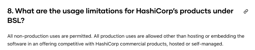 In our opinion, if you are a business that is embedding and distributing Terraform, regardless of whether HashiCorp has a competing product today or not, you should talk to HashiCorp and get a custom license. It would be prudent to revisit the reliance on HashiCorp’s terraform.