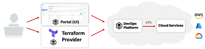 Many DevOps Platforms are built by using Terraform underneath to orchestrate resource provisioning in cloud providers. Terraform in turn calls the cloud provider APIs. There are many technical drawbacks to this approach and are detailed in this blog. The key rationale is that one cannot build a distributed system like a DevOps platform using unattended scripts. Instead we need a systems approach where the platform implementation, using a higher level language (like Java, Go, or Python), orchestrates the cloud provider’s APIs directly. Terraform should certainly be leveraged, but only at the External interface by having a provider that gives an IaC interface to the platform along with API and UI. This has several advantages: