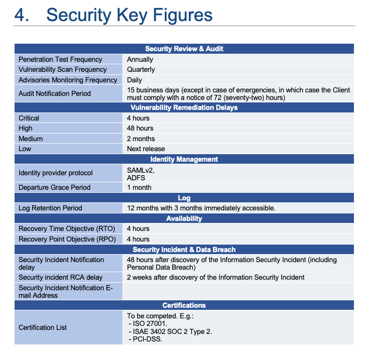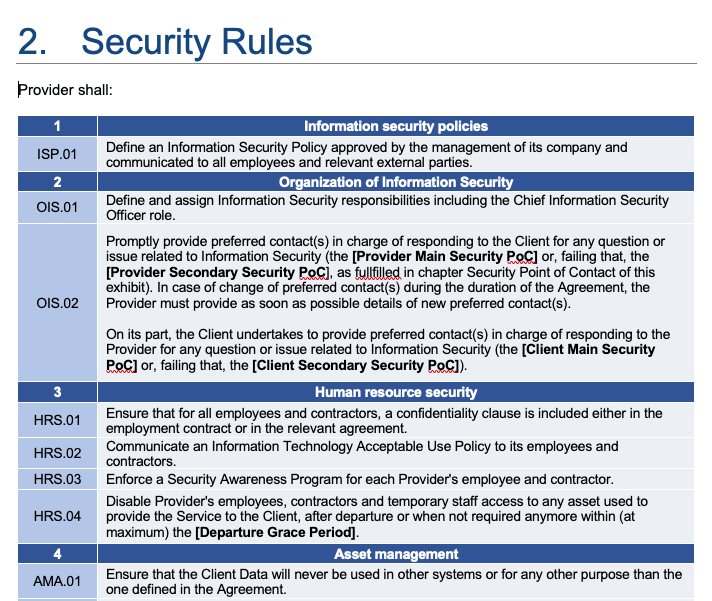 It starts with some general guidelines in legal speak, “The Provider acknowledges that security is a fundamental requirement for the framework of performance of the Services. To this end, the Provider undertakes to implement appropriate technical and organizational measures in accordance with industry standard practices.” and starts to rattle off familiar acronyms like ISO27001, PCI-DSS, GDPR, HIPAA, or SOC 2.