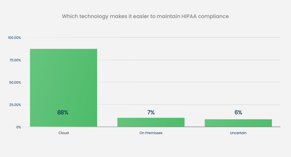 Once transitioned, the worries of maintaining compliance on the cloud seem to melt away. 88% report more easily maintaining compliance in the cloud than on-premises hosting. Professionals surveyed from all types of healthcare organizations shared this sentiment.