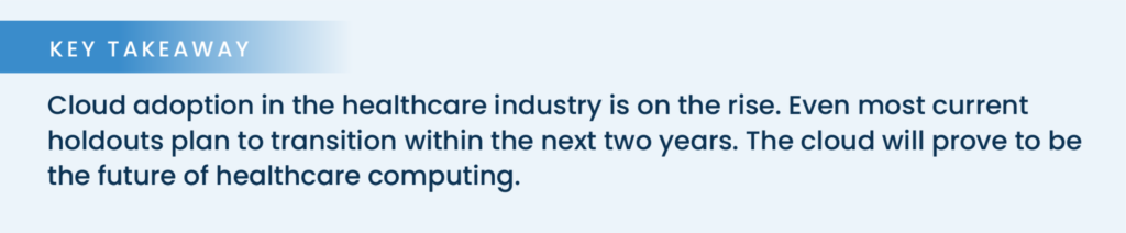 Cloud computing adoption is prominent throughout the healthcare industry and continues to expand. Organizations that haven’t made the transition yet will most likely do so within the next two years and will likely seek out aid from third-party tools and services.