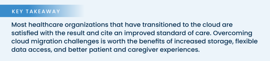 Administrators cited numerous benefits to their operations once they’ve transitioned to the cloud. Increased data storage capacity was the most significant benefit cited (58%). No benefit ranks lower than 40%, meaning healthcare organizations will likely find additional improvements beyond their initial reasons for making the transition. Other cited benefits to cloud migration include: