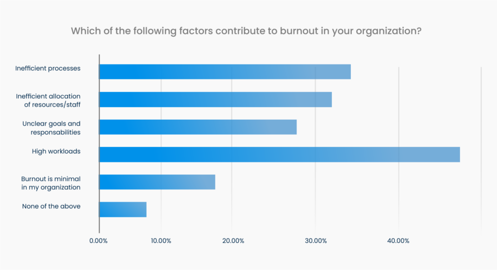 When examining the source of burnout employees face, 47.2% say burnout is caused primarily by high workloads. The next most commonly cited cause of burnout is inefficient processes, at 35.2%.