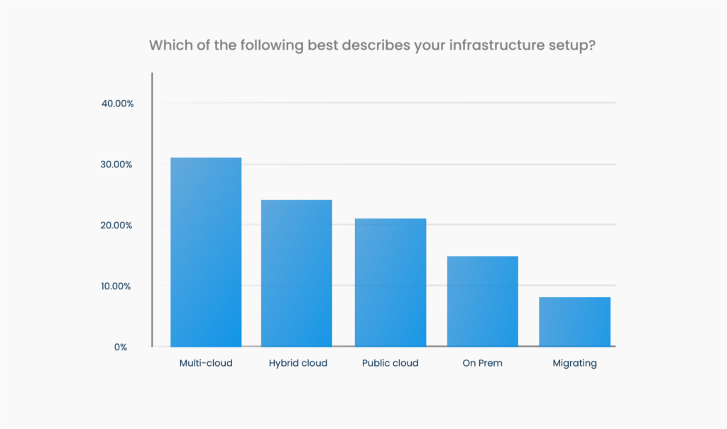 Over 85% of respondents are either on the cloud or currently migrating. 31.2% of developers work within a multi-cloud infrastructure, with most others either working in public or hybrid clouds or migrating. The number of organizations utilizing only on premises configurations continues to shrink — less than 15% are strictly on premises.