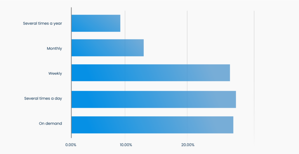 78% of developers deploy code at least once per week, if not more. Thanks to a combination of DevOps processes, cloud computing configurations, and containerization, developers are no longer afraid to make regular deployments. Deployment times greater than a week are a thing of the past.