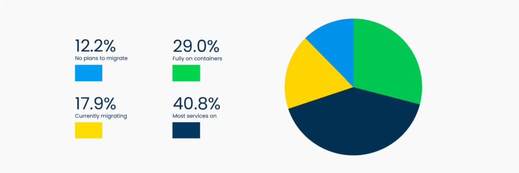 Along with cloud computing, 69.8% have most or all services on containers, using them as the foundation for their DevOps processes. Plus, a further 18% are currently migrating, with only 12% reporting no plans to migrate to containers.