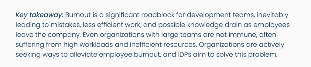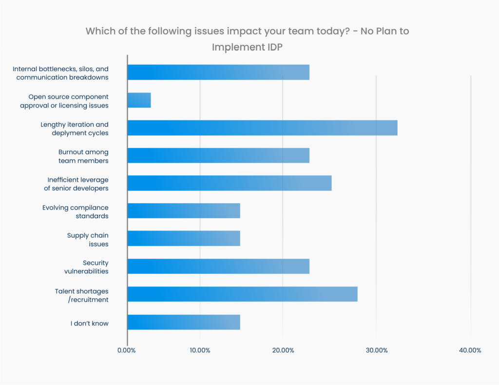 32.5% of respondents with no plan to implement an IDP see lengthy iteration and development cycles as their team’s biggest issue. The next most significant concern is talent shortages and recruitment at 27.5%. 37.5% of respondents further claim that burnout is minimal at their organization.