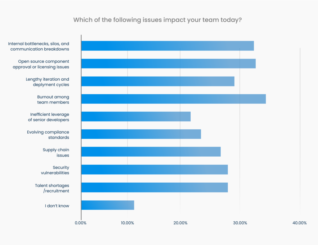 34.2% of respondents say burnout is their team’s number one issue. Open source component approval or licensing issues are very close behind at 32.4%. Burnout and resource bottlenecks are causing roadblocks in day-to-day operations.