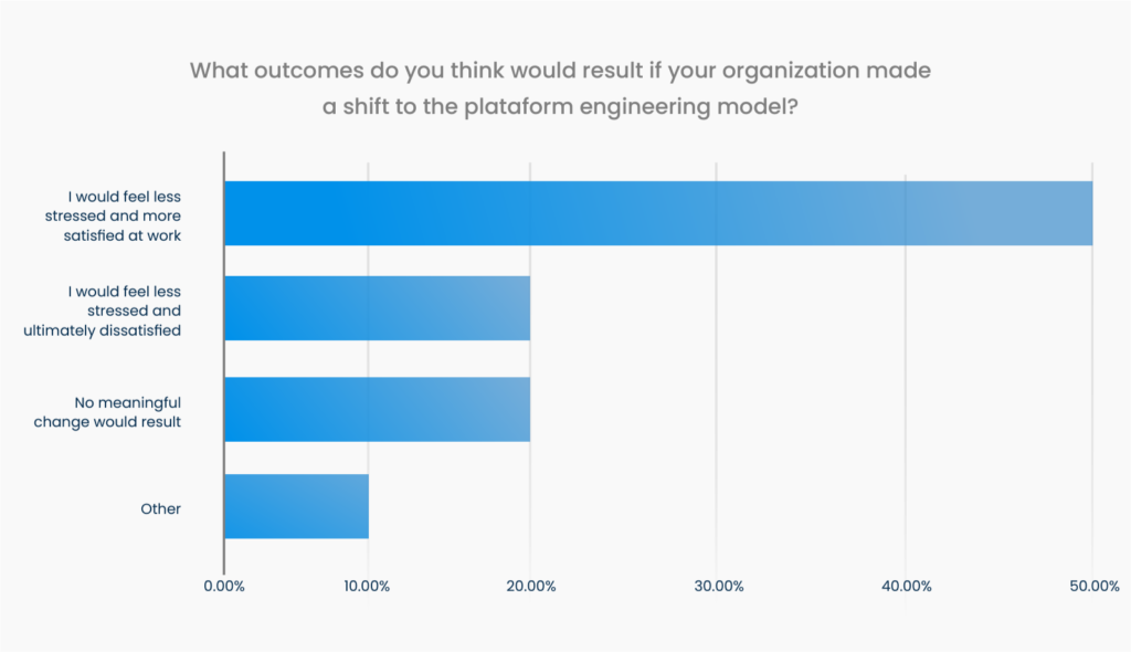If your organization isn’t considering implementing an IDP, chances are people want it. 50% of all respondents say a platform engineering model would make them feel less stressed and more satisfied at work. Do not let institutional roadblocks or old ways of thinking prevent you from adapting.