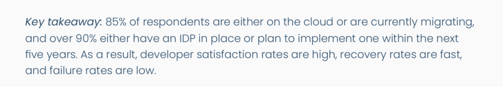 - Internal development platform (IDP) adoption is set to exceed 90% within the next five years. Platform engineering solutions are highly desired, and organizations are working to implement them.