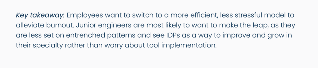 - IDPs are a potential solution for solving employee burnout. 50% of respondents would feel less stressed and more satisfied at work if their organization shifted to a platform engineering model.