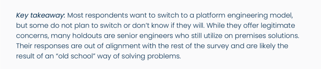 While most respondents either want to transition to an IDP or already have, 16.6% do not plan to implement a platform engineering model or don’t know if they will.