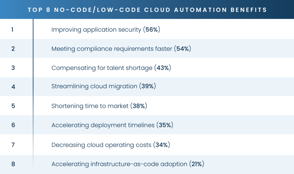 The next three benefits are all within 5% of each other, with many respondents noting no-code/low-code cloud automation’s ability to mitigate the impact of the talent shortage (43%), streamline cloud migration (39%), and shorten an application’s time to market (38%).