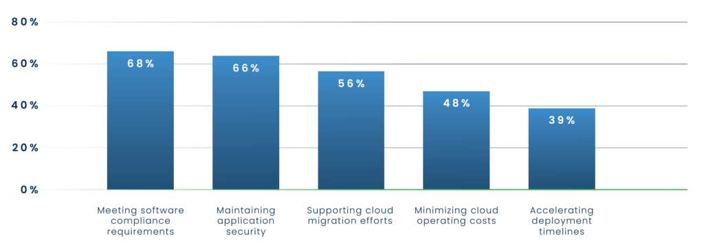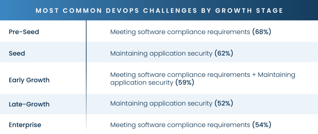 While the top concern varies by growth stage, compliance and security were consistently mentioned as the fastest-growing challenges developers face. 68% of our respondents said that meeting compliance requirements had become increasingly difficult in the past 24 months, and 66% noted that maintaining application security had become even more critical for them over the same period. Navigating cloud migration (56%), cutting cloud operating costs (48%), and speeding up the pace of deployment (39%) were also highlighted by many of the IT executives surveyed.