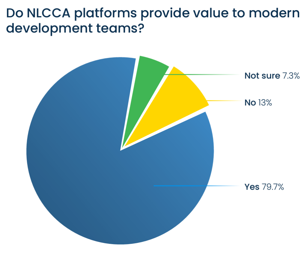 Although priorities might shift depending on a company’s maturity, the answer our respondents’ gave to these challenges was nearly unanimous: Nearly 80% of respondents believe that no-code/low-code platforms can help address these challenges.