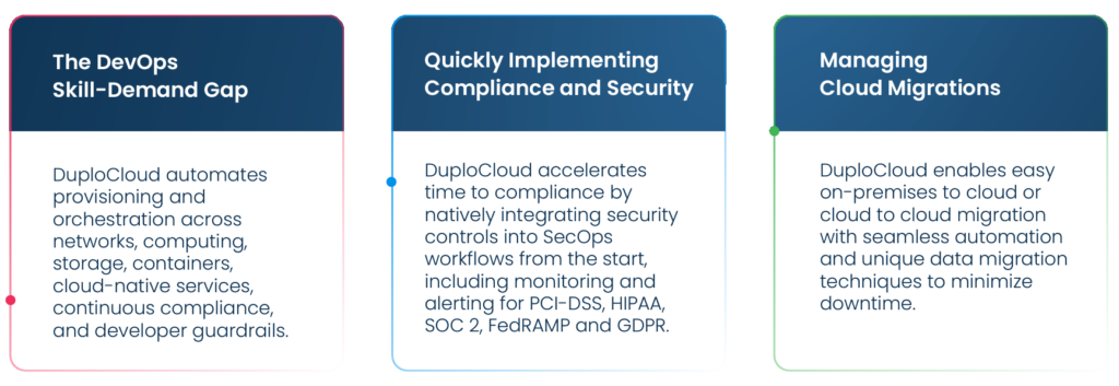For those looking to realize these benefits, finding the right tech partner is the first step in the implementation process. Built by founding members of the Microsoft Azure team, DuploCloud is an no-code/low-code cloud automation platform that addresses the main issues plaguing IT departments managing the development of cloud applications.