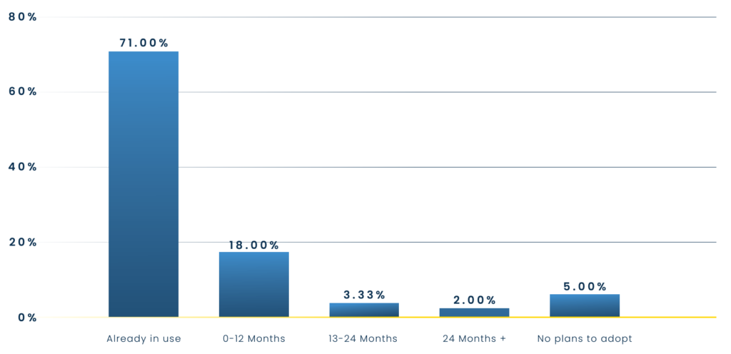 71% of IT executives we surveyed said their organization had already incorporated no-code/low-code cloud automation platforms into their development pipelines; 18% said adoption was a year out or less; and another 3% reported it was on their company’s two-year roadmap. If these plans are executed, the adoption of no-code/low-code cloud automation solutions will increase by 21% over the next two years — becoming near-universal (92%) among our respondents.