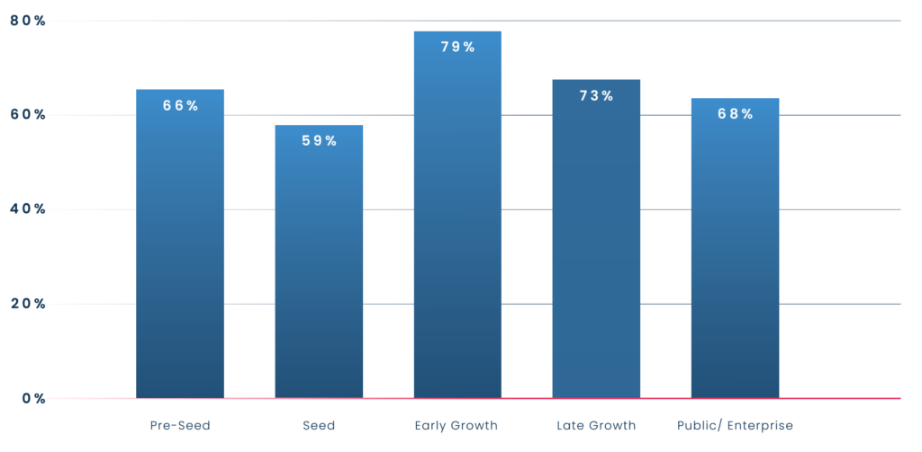 The data reveals that the vast majority of respondents had already adopted these tools as part of their company’s core workflows — and that adoption among respondents would reach 92% within two years. The data also suggests that adoption of these platforms is widespread across teams regardless of organizational maturity and size, with the lowest implementation rate (which was among seed-stage companies) still at 59%.