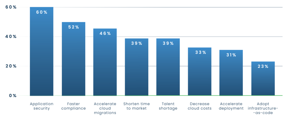 The number one reason given for no-code/low-code cloud automation adoption was to improve application security (60%), with speeding up compliance (52%) a close second and accelerating cloud migration (46%) in third. These top three motivations overlap directly with what our respondents ranked as the top three fastest-growing cloud development challenges.