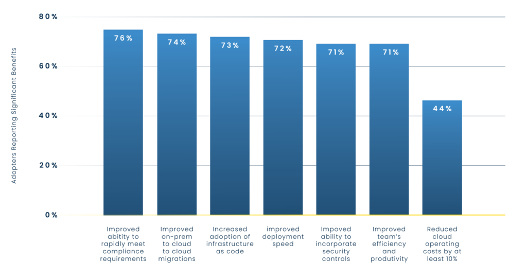 At least 70% of respondents said that no-code/low-code cloud automation solutions had significantly improved their ability to meet compliance requirements, manage cloud migrations, implement security controls, quickly deploy applications, cultivate the adoption of infrastructure as code (IaC), and operate efficiently.