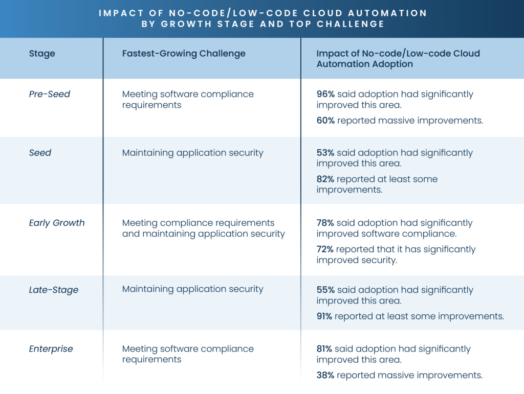 While these results alone are a ringing endorsement of no-code/low-code cloud automation adoption, the data is even more compelling when broken down by growth stage and top concern. Our research indicates that no-code/low-code cloud automation solutions deliver where it counts regardless of company maturity.