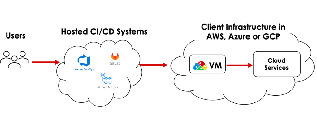 Builds are executed in the CI/CD platform’s SaaS infrastructure and outside of the organization’s infrastructure. For the builds to reach the infrastructure they need either credentials or VPN access. DuploCloud’s Platform facilitates this by providing JIT (Just-in-Time) access scoped to Tenants for the build pipelines. Users create a “CICD” user in the DuploCloud portal that has limited access to the desired Tenants. A token is created for the user and added to the CI/CD pipelines. The most common example of a workflow is when one builds a Docker image and pushes the Docker image to the Cloud Provider registry. Access to the cloud provider registry is facilitated via DuploCloud.