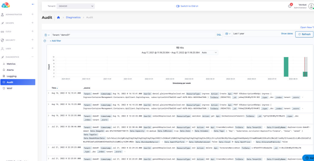 When using raw IaC without a management system like DuploCloud, DevOps teams build cloud deployment from an operations and infrastructure perspective, rather than from the application perspective. Many times resources are not appropriately tagged with an application context and if you require an audit trail at the cloud provider level, as with AWS CloudTrail or Azure event logs, it can be hard to correlate to the application. In DuploCloud, audit trails are available per Tenant with detailed metadata in the trails in an application-specific context.