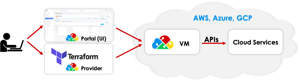 None of the platforms (Azure, AWS, Kubernetes, etc.) are built on top of scripting tools. They are all written with higher-level programming languages. IaC is a scripting tool that executes instructions serially and is meant to be attended by a human. A self-service cloud automation solution requires an intent-based platform where you define a higher-level specification and the platform asynchronously applies the configuration to the cloud provider by coordinating various dependencies in a state machine. You cannot build a self-service cloud management platform using Terraform.