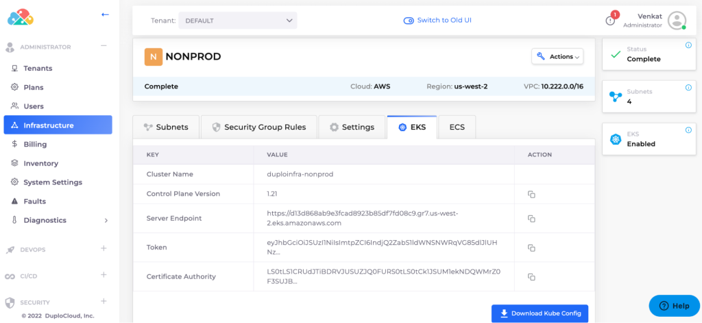 Developers occasionally need access to direct cloud portals and services, Kubectl, and access to the application container’s shell. DuploCloud creates just-in-case access into these systems by orchestrating underlying substrates like Kubernetes Service accounts, AWS federated login, and Azure AD. This is done on an as-needed basis using principles of least privilege; for example, when a user gets access to Kubectl, the access is scoped to the tenant’s namespace only.