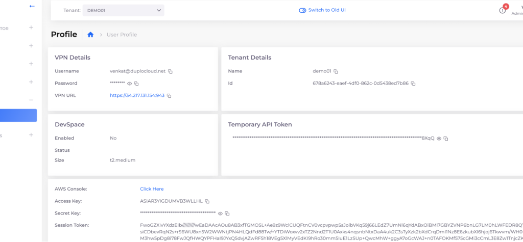 Developers often need to build and test code in a local environment. They need access to cloud provider services via access keys. DuploCloud facilitates that by creating Tenant scoped keys with a limited lifetime. See the documentation page JIT Access: Access Through Command Line for more detailed information.