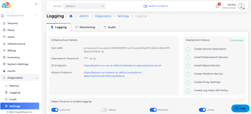 Central logging is implemented by orchestrating Elasticsearch, Kibana, and File Beat. Internally, nuances for AKS service accounts, ES ILM policy, index lifecycle and other low-level details are automated. Kibana dashboards are displayed per Tenant and per service.