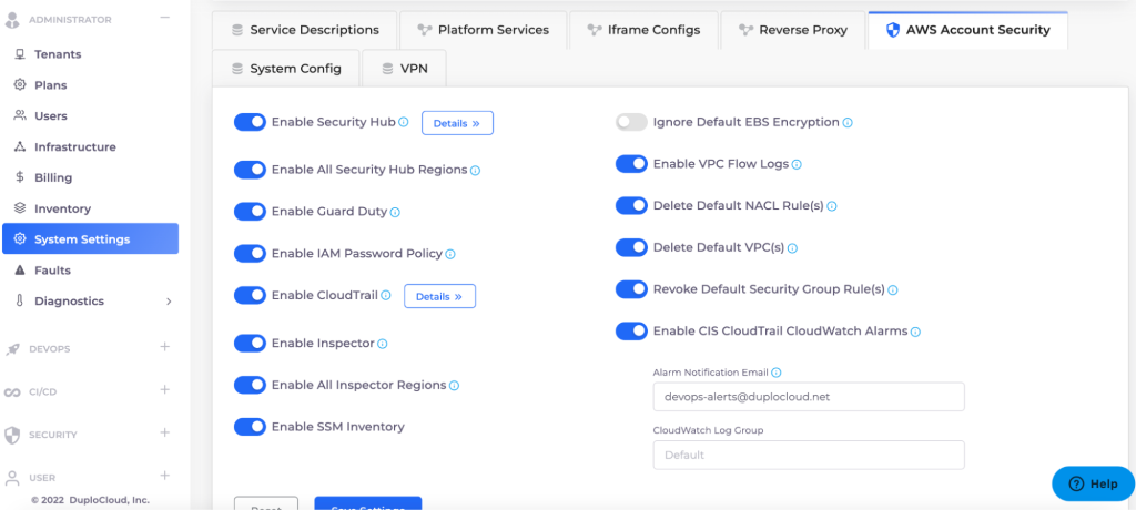 DuploCloud integrates natively with cloud provider-native solutions like AWS Security Hub and Azure Defender that includes setup, management, and operations.