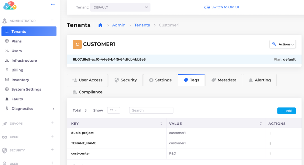 By default, all resources are tagged by Tenant name and the custom tags set by the user at the Tenant level. When new resources are created within the Tenant, all tags are automatically propagated to all the underlying resources associated with the Tenant.