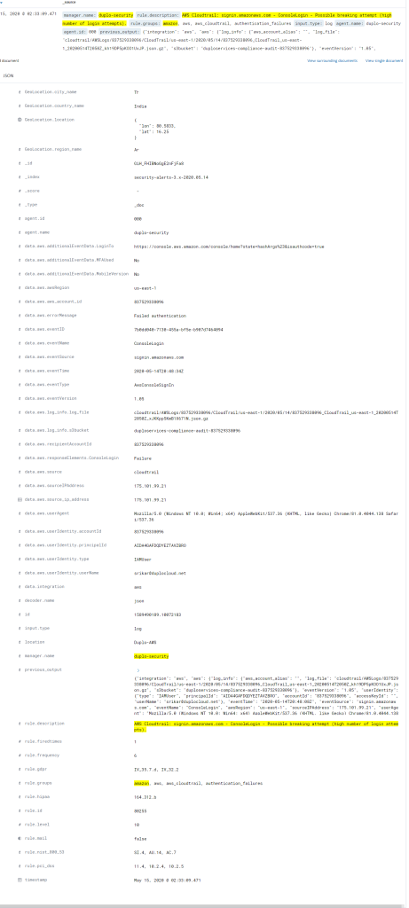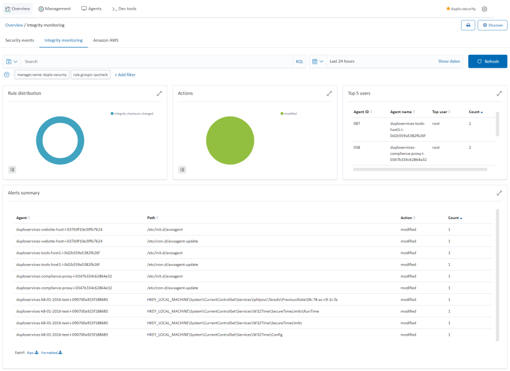 3Implements Change-Detection Mechanisms—The IT system includes a change-detection mechanism (for example, file integrity monitoring tools) to alert personnel to unauthorized modifications of critical system files, configuration files, or content files. DuploCloud implements multiple layers and aspects of monitoring. Elastic Search is implemented for central logging which is configured for alerts using text patterns. CloudWatch, Azure monitoring, Prometheus and Grafana are used for monitoring infrastructure metrics. Various security monitoring is achieved by enabling Cloud trail, AWS config, OSSEC, ClamAV, etc. and the results centralized in a SIEM solution. This includes various checks like FIM, IDS, SCA, CIS Benchmarking, etc.