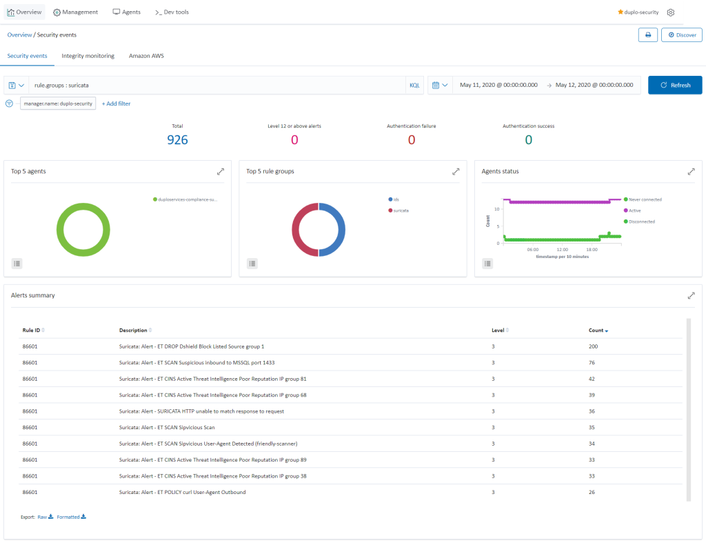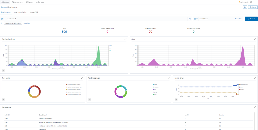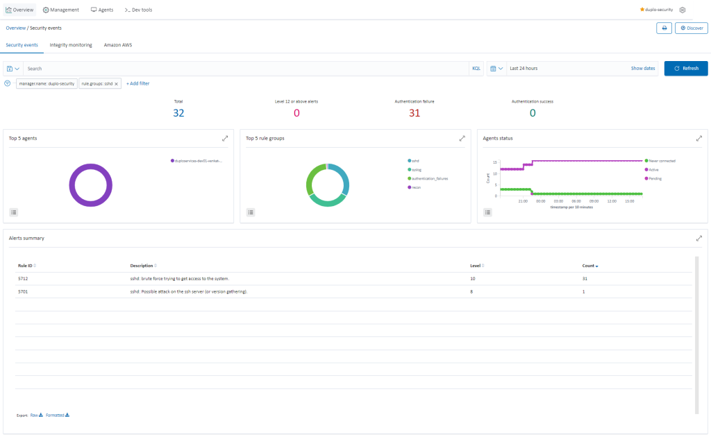 2Communicates and Reviews Detected Security Events—Detected security events are communicated to and reviewed by the individuals responsible for the management of the security program and actions are taken, if necessary.DuploCloud’s overall management platform which includes the SIEM enables operations team to have this evaluation procedure periodically and substantially reduces the man hours required for the process.