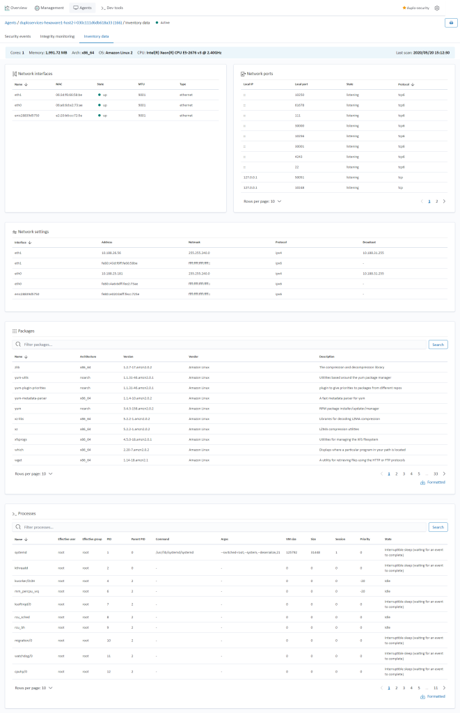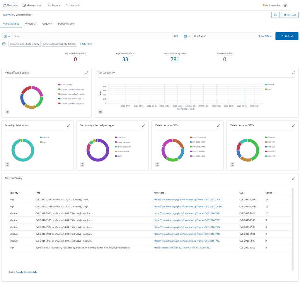 Distributed agents of this platform are deployed at various endpoints (VMs in Cloud) where they collect events data from various logs like syslogs, virus scan results, NIDS alerts, File Integrity events, etc. Data is sent to a centralized server and undergoes a set of rules to produce events and alerts that are stored in typically Elasticsearch where dashboards can then be generated. Data can also be ingested from sources like CloudTrail, AWS Trusted Advisor, Azure Security Center and other non-VM based sources.