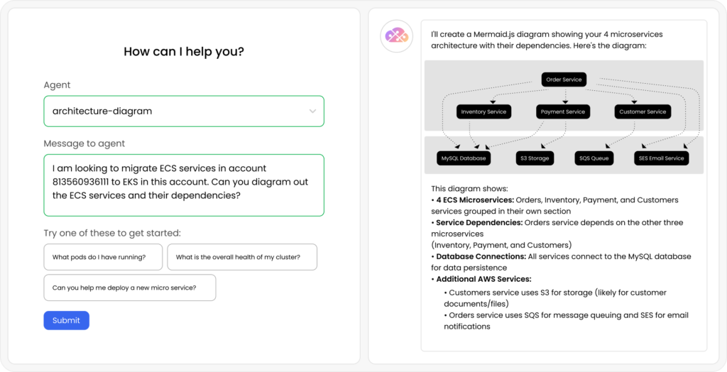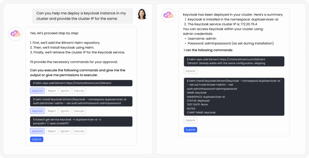 Go beyond chat. AI-driven observability dashboards and purpose-built forms let engineers deploy a database, stop a server, or approve a config change with SaaS-like convenience.